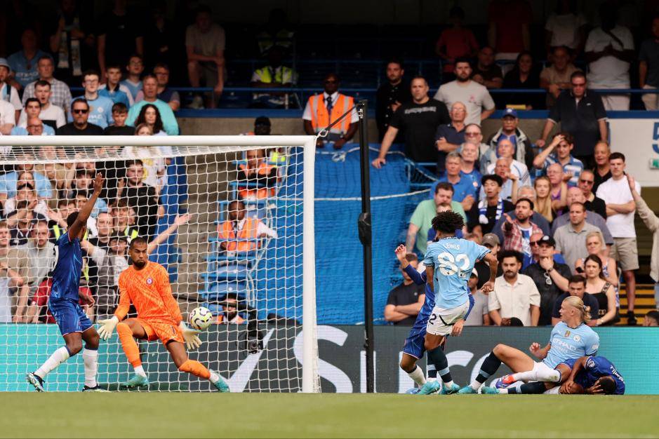 多库回到左路便满血复活,第18分钟,比利时边锋一个标志性的内切摆脱后送出斜塞,哈兰德得球后趟过科尔维尔,顶住库库雷利亚的冲撞,面对出击封堵的桑切斯轻巧地搓了个反向,皮球慢悠悠地滚进了球门。